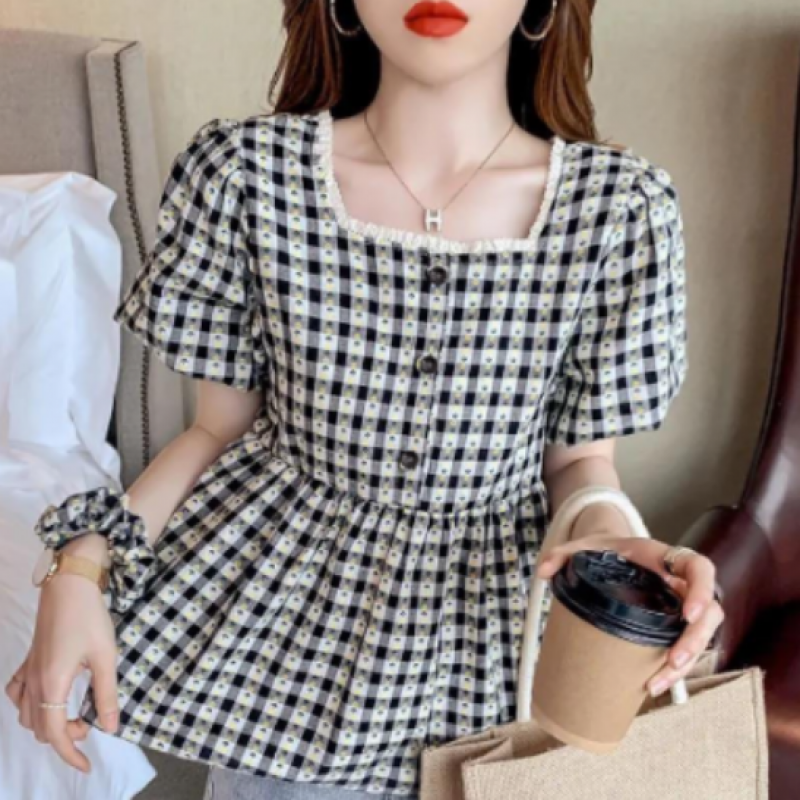 Blusa con volantes y mangas abullonadas para mujer, elegante blusa de verano de dise?o a cuadros, cuello cuadrado, línea A, para ni?os (2 piezas)